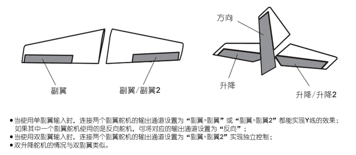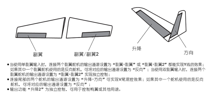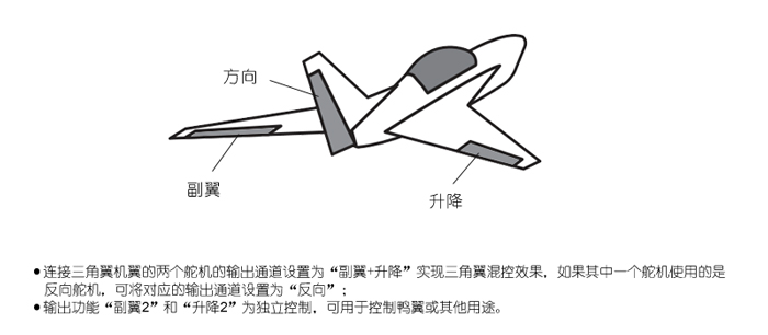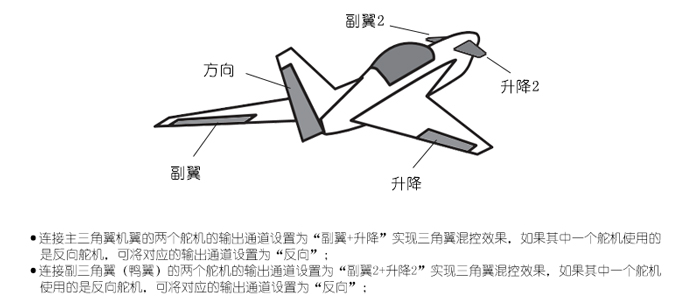 - 取消三角翼模式下輸出功能"副翼2"和"升降2"混控,改為獨立控制通道,可用於控制鴨翼或其他用途;