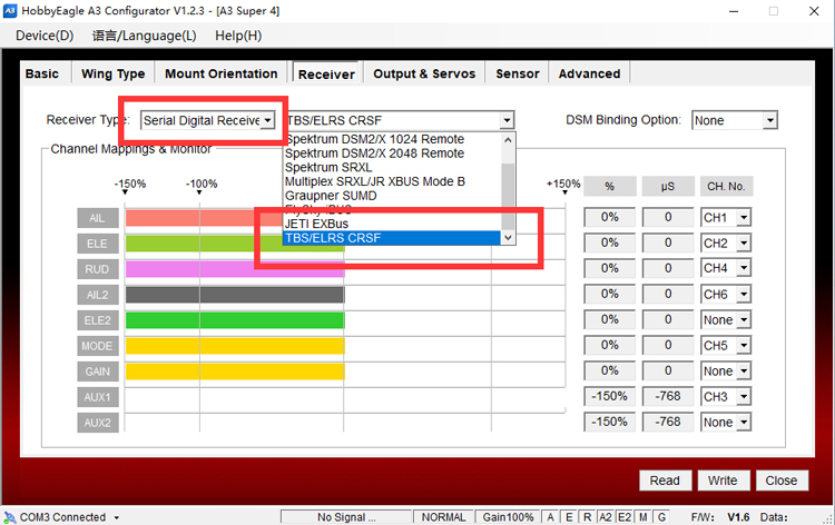 CRSF is a high bandwidth, low latency digital serial protocol designed by Team BlackSheep, supports bi-directional transmission, designed primarily for high-speed data transmission between a receiver and other devices. The open source radio system ExpressLRS also uses CRSF on their receivers. By updating the latest firmware V1.6, A3 Super 4 and A3 Mini can support CRSF now and allow you to connect the gyro to a TBS or ELRS receiver with one single wire.