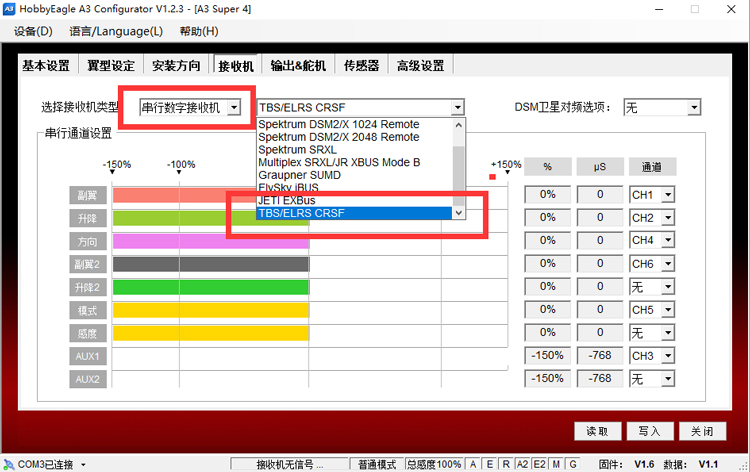 使用最新版本的A3 Configurator(V1.2.3或以上)或将设置卡X升级到最新版本(V1.6或以上),更改陀螺仪的接收机类型为"串行数字接收机->TBS/ELRS CRSF"模式,并对通道定义表进行设置以符合发射机上的通道顺序,最后重启陀螺仪使新的设置生效。