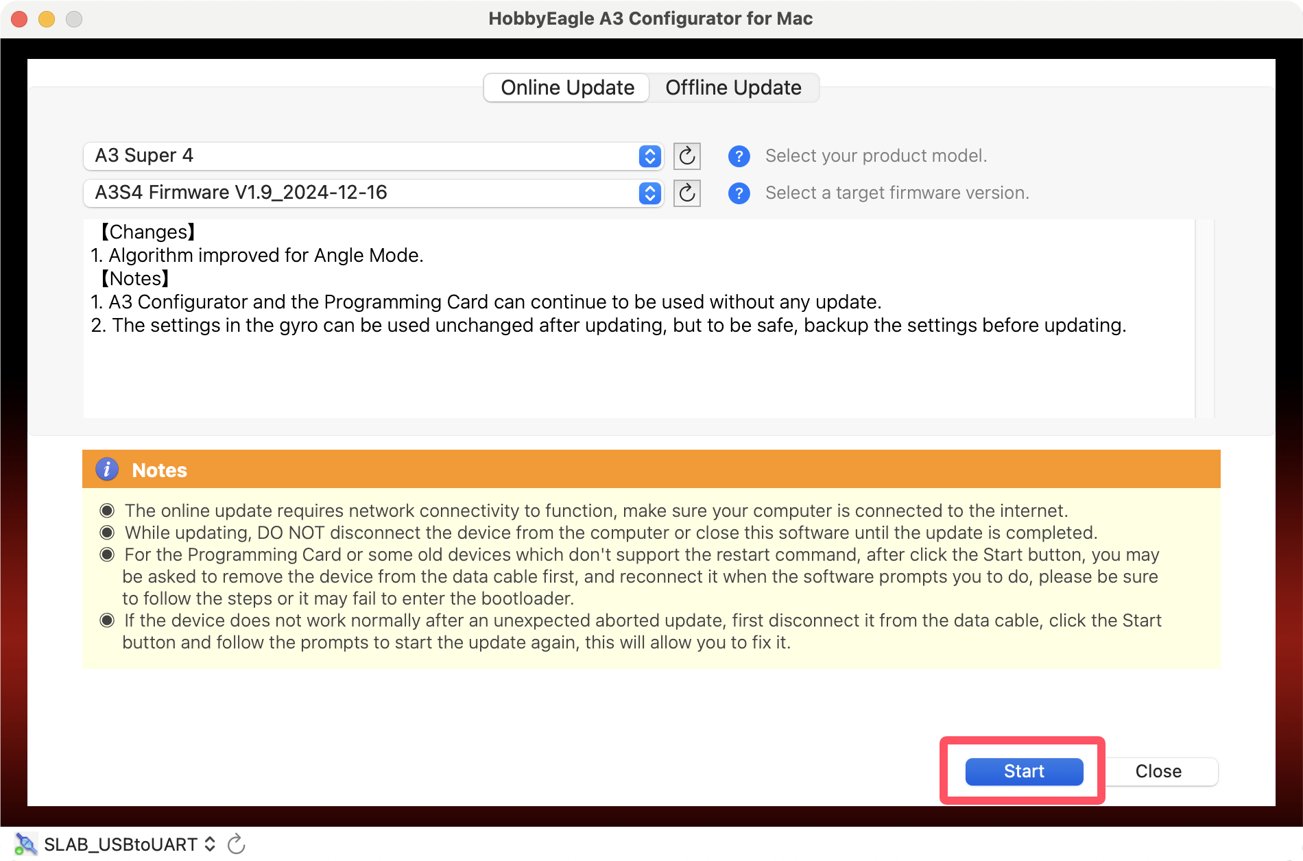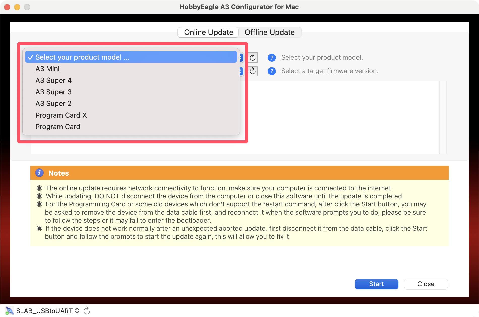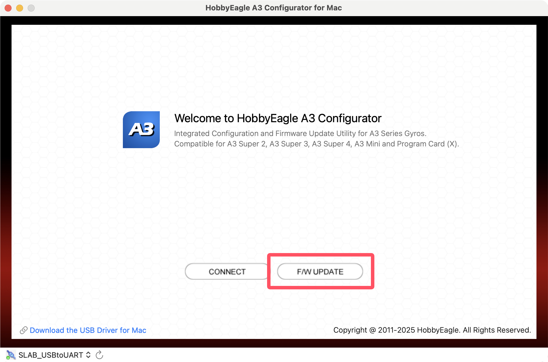 Plug the adapter into the USB port of the Mac, you may need to use an adapter cable of USB-A to USB-C if your Mac only has Type-C ports. Open the A3 Configurator and you will be directed to the welcome page. Choose the port named SLAB_USBtoUART on the bottom-left corner, the correct port will always be selected automatically if the USB driver is installed properly, if it doesn't appear in the port list, try to re-install the USB driver for Mac.