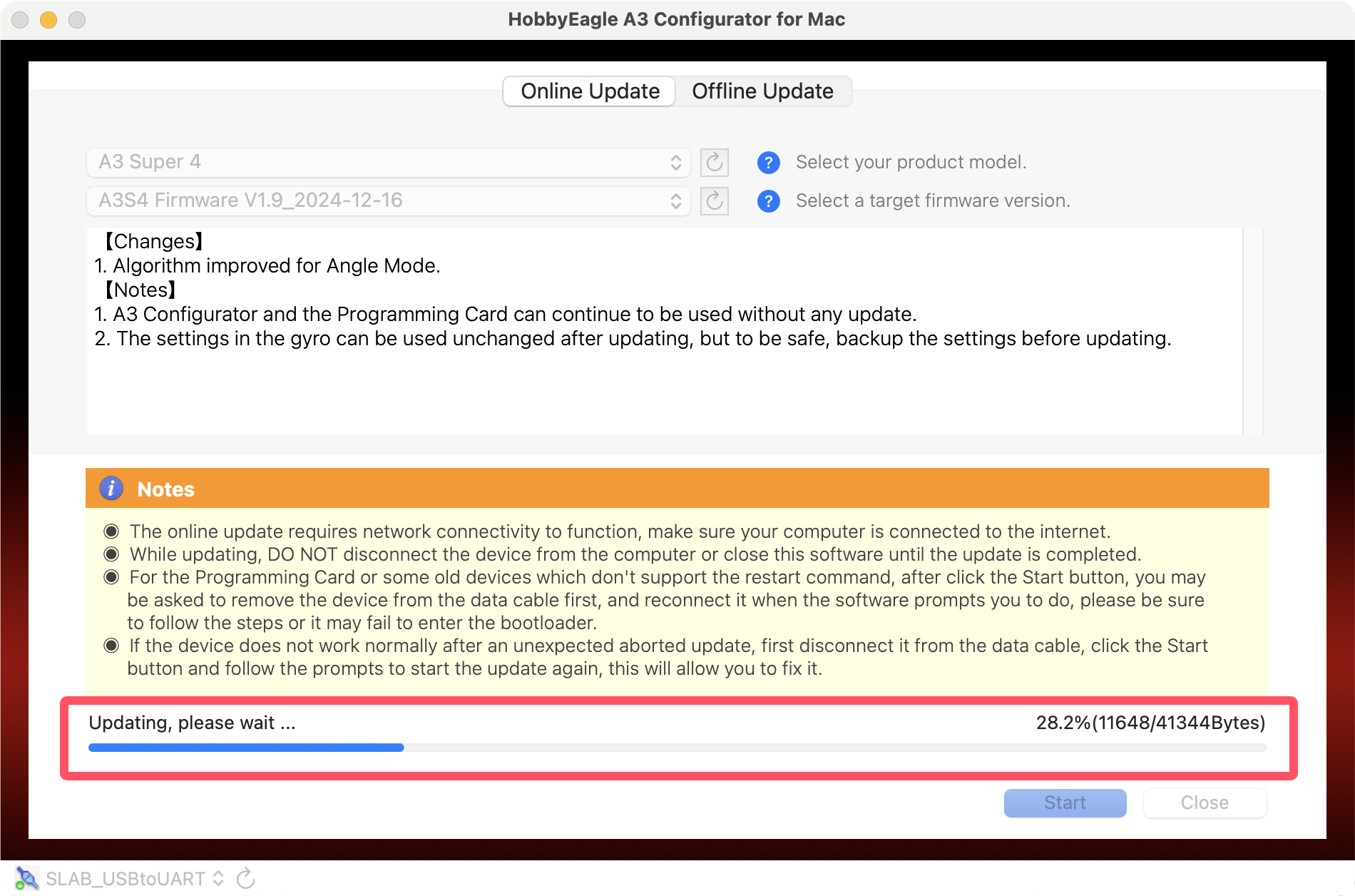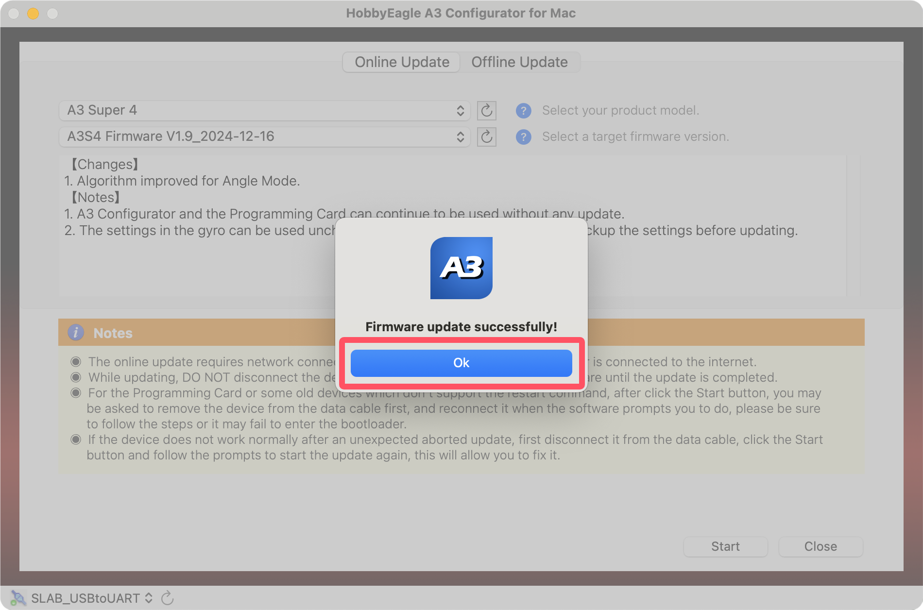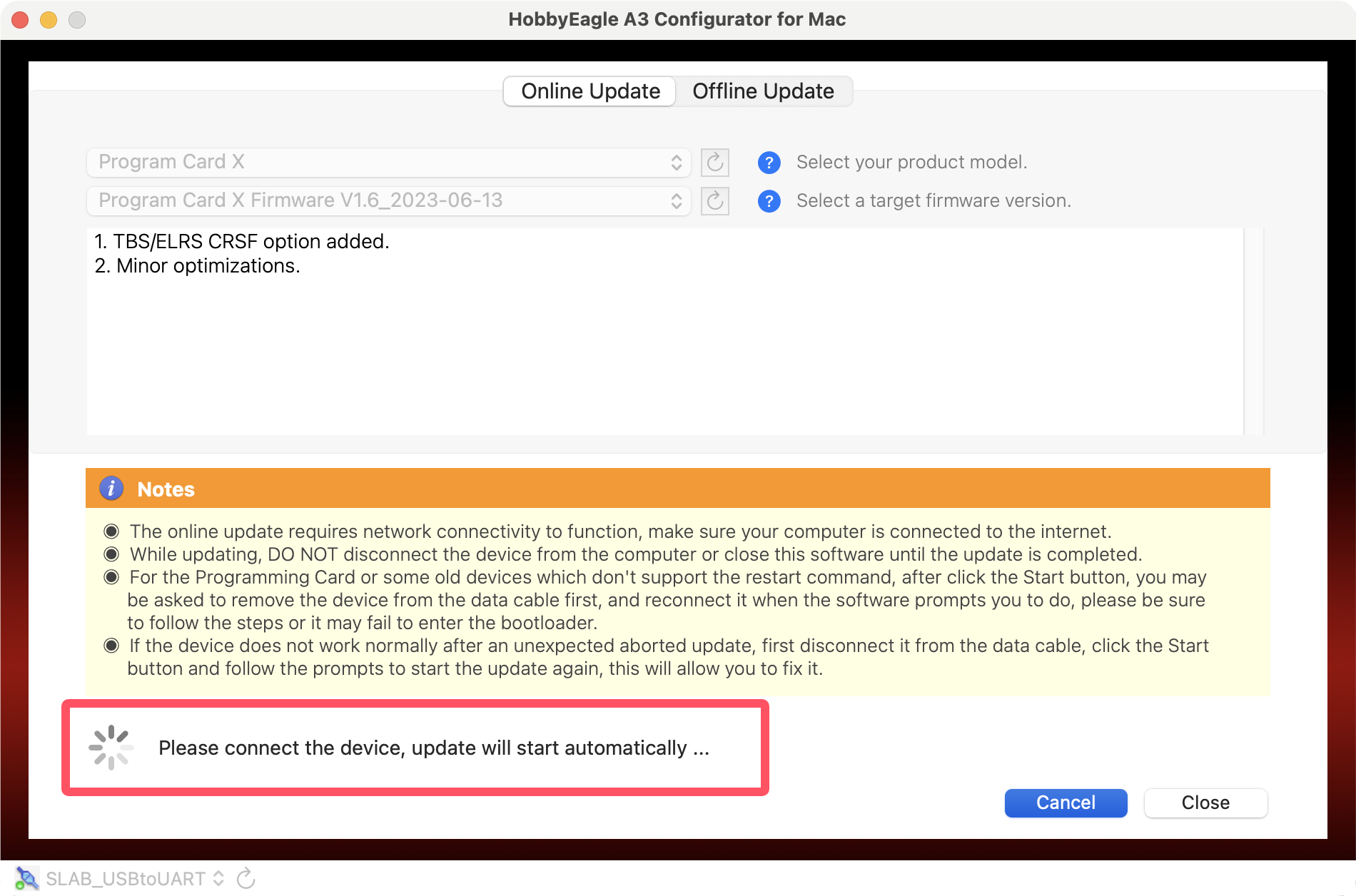 Plug the adapter into the USB port of the Mac, you may need to use an adapter cable of USB-A to USB-C if your Mac only has Type-C ports. Open the A3 Configurator and you will be directed to the welcome page. Choose the port named SLAB_USBtoUART on the bottom-left corner, the correct port will always be selected automatically if the USB driver is installed properly, if it doesn't appear in the port list, try to re-install the USB driver for Mac.