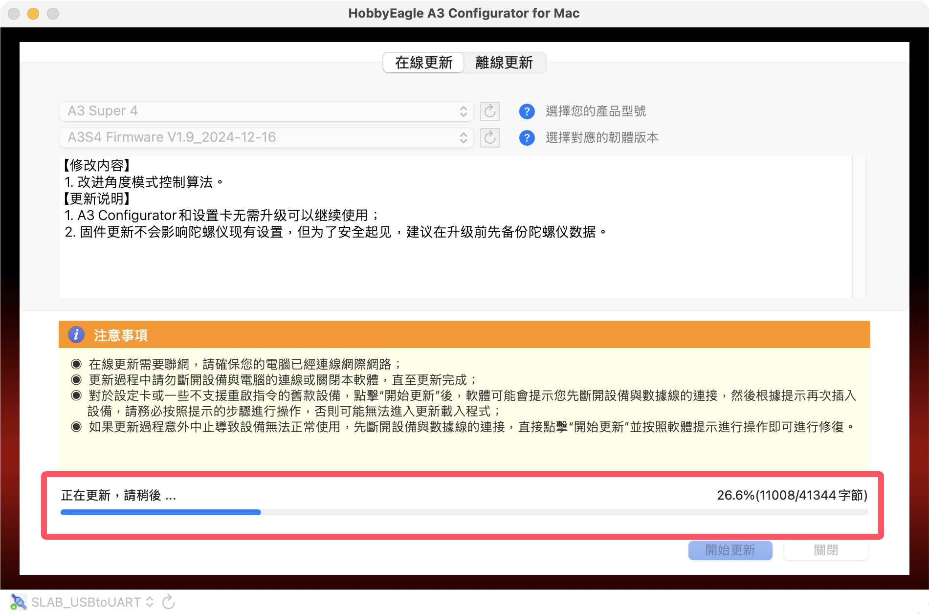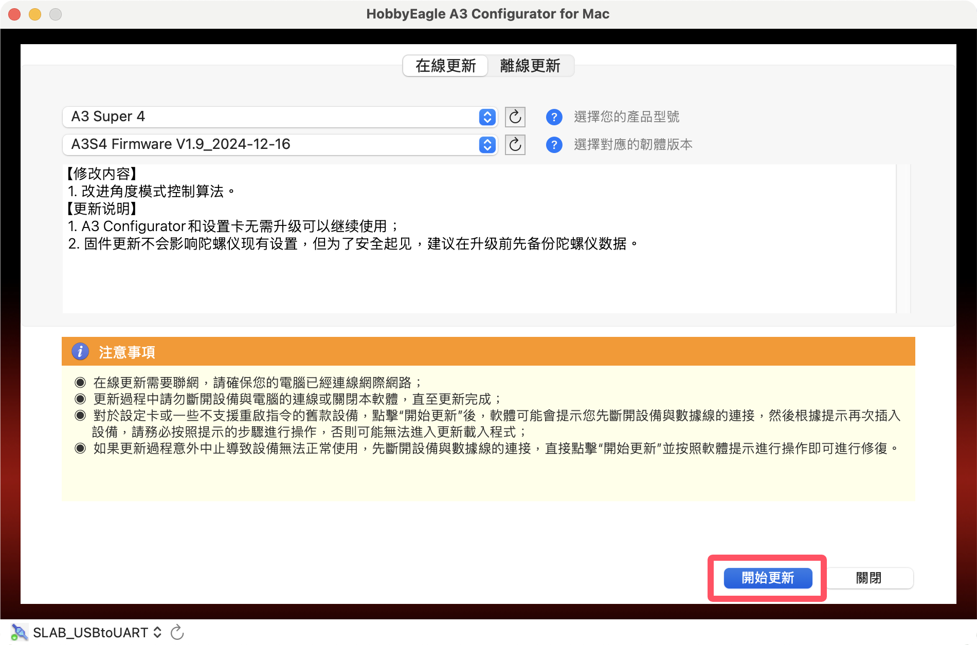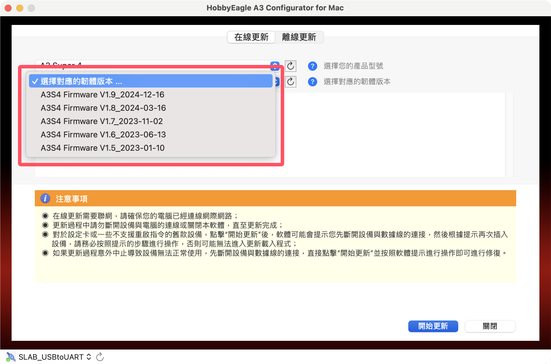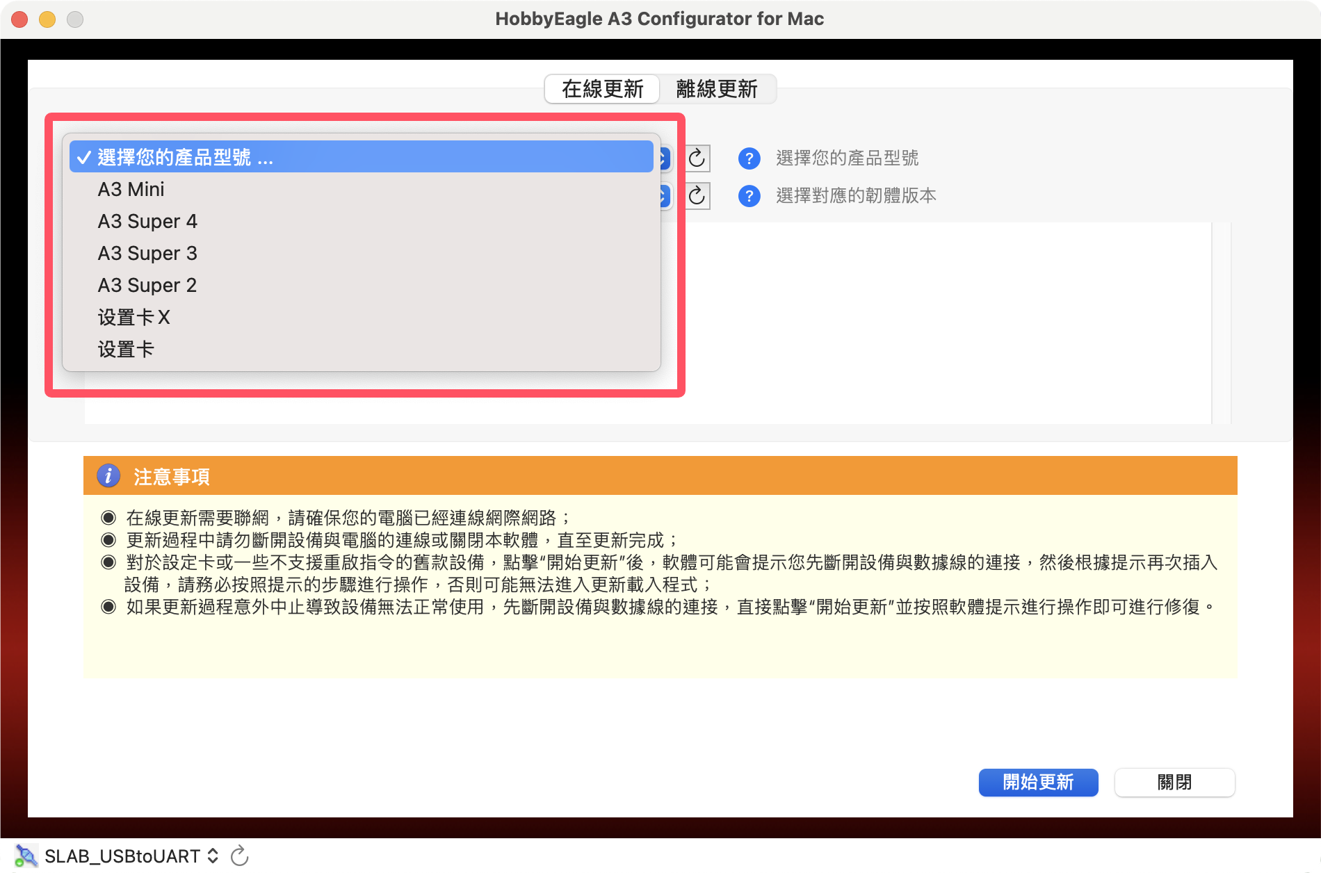 將USB適配器插入Mac的USB端口,如果您的Mac只有Type-C端口,請使用USB-A轉USB-C的轉接線進行連線。運行 A3 Configurator,打開主畫面,在左下角選擇 SLAB_USBtoUART 端口,如果您正確安裝了USB驅動程式,軟體一般情況下會自動選中該端口,如果端口列表中沒有這個端口,請重新安裝驅動程式。