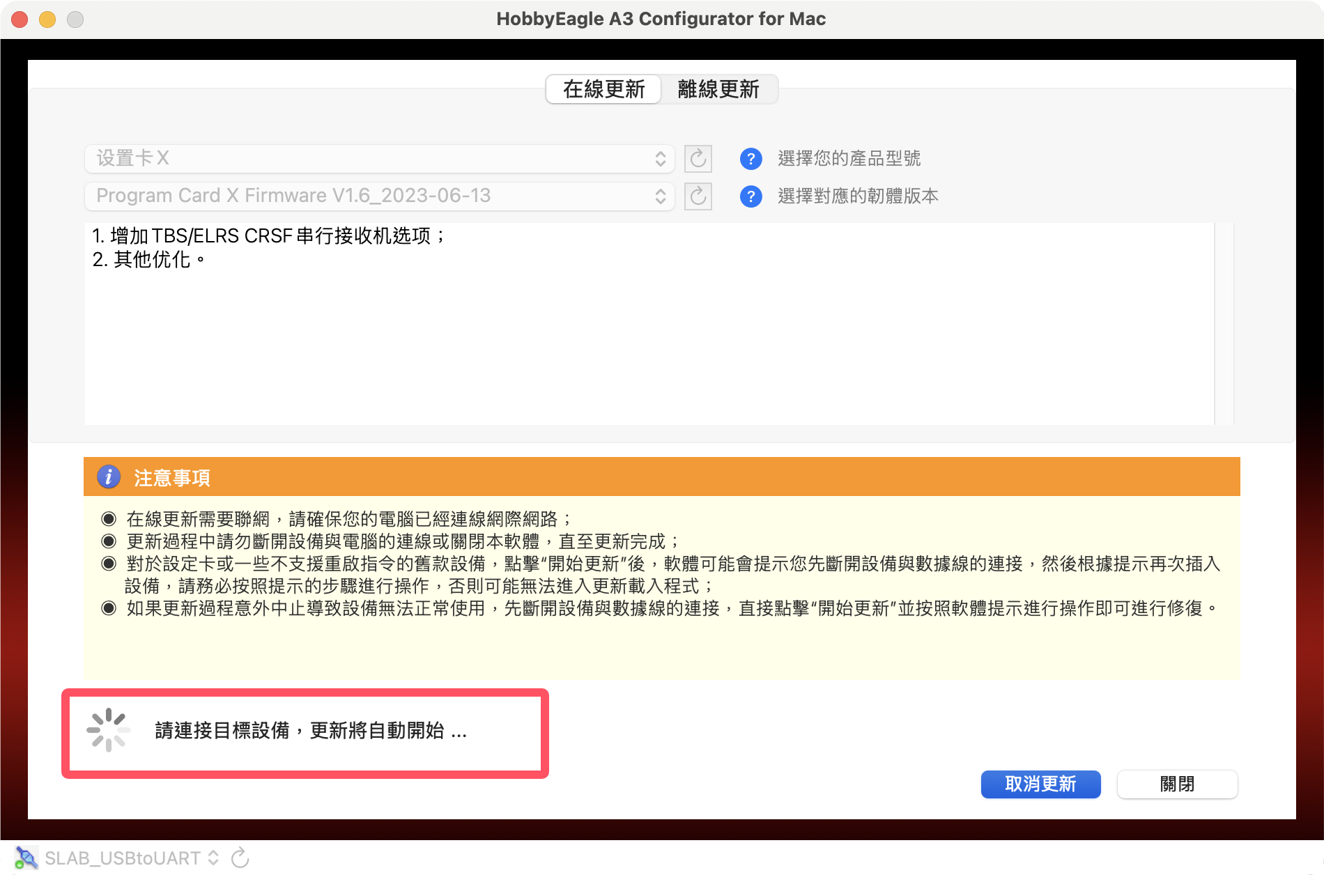 等待軟體畫面出現"請連接目標設備,更新將自動開始 ..."的提示資訊後,此時將設定卡或設備連接到數據線的另一端,更新就會自動開始: