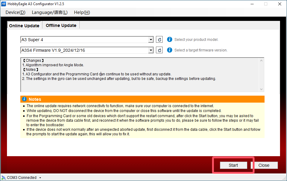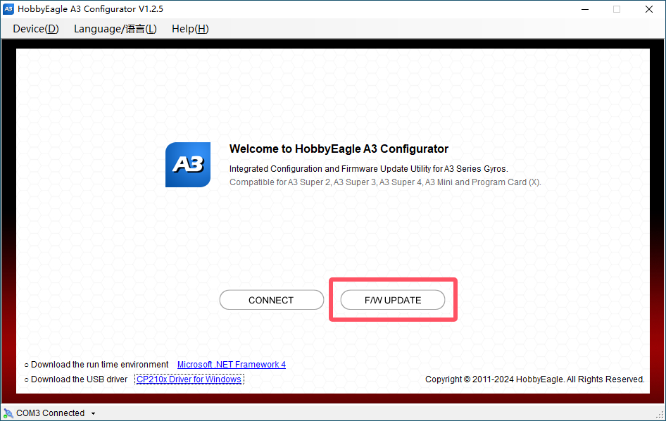 Connect the gyro to the other end of the data cable, the gyro will power up, after the initialization is done, click the "F/W UPDATE" button to open the firmware update wizard.