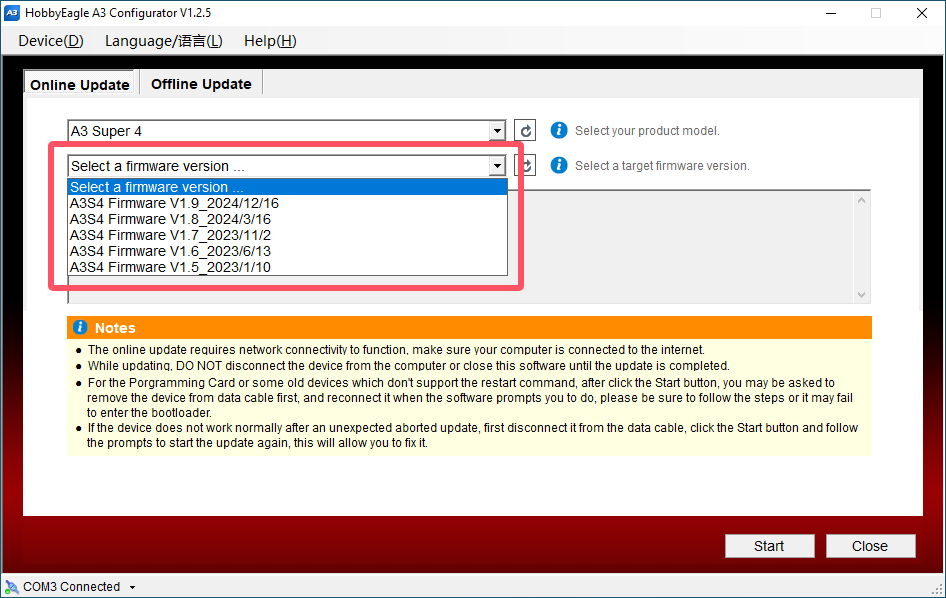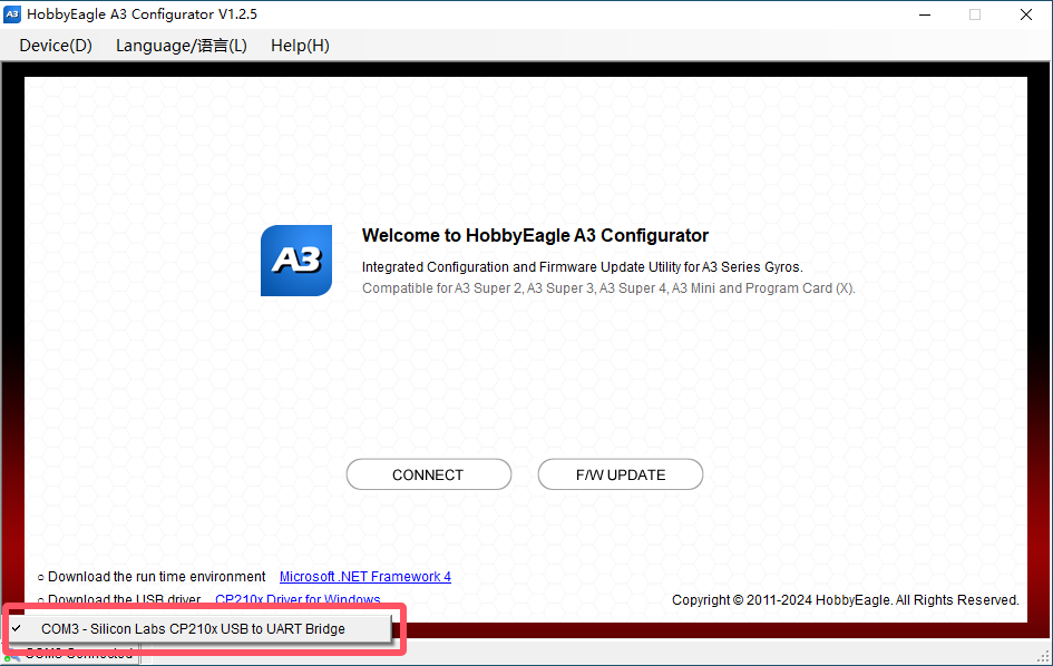 Plug the adapter into the USB port of the PC, open the A3 Configurator and you will be directed to the welcome page. Choose the port named COMx - Silicon Labs CP210x USB to UART Bridge on the bottom-left corner, the correct port will always be selected automatically if the USB driver is installed properly, if it doesn't appear in the port list, try to re-install the USB driver.