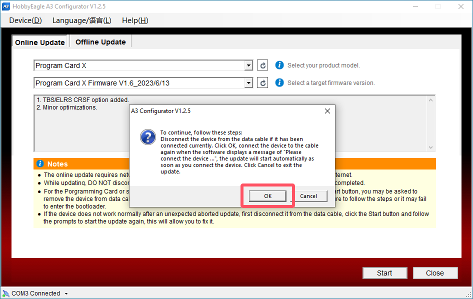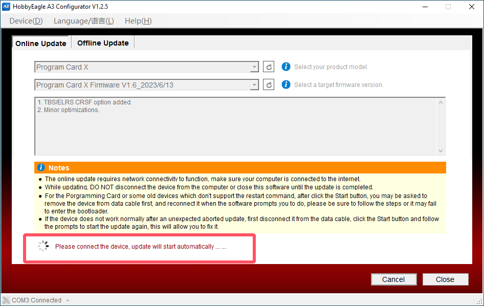 Connect the program card or device to the other end of the cable again when the software displays a message of "Please connect the device ...", the update will start automatically.