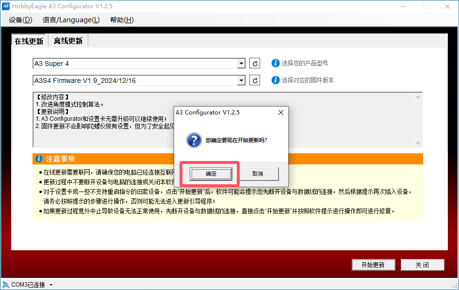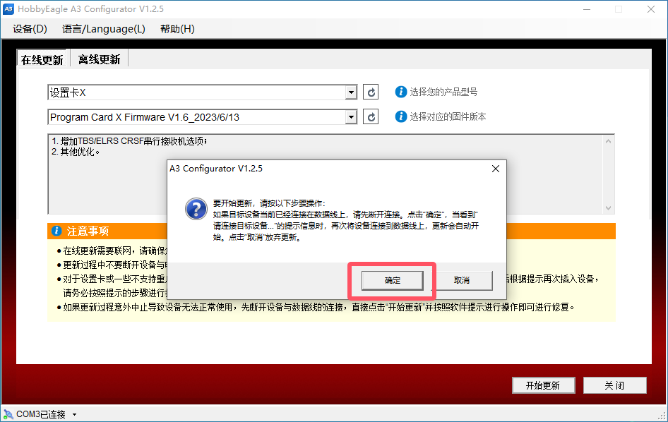 对于设置卡或一些不支持重启指令的旧款设备,点击“开始更新”按钮后,软件可能会弹出如下提示信息,这时请先断开设置卡或设备与数据线的连接,然后点击“确定”按钮: