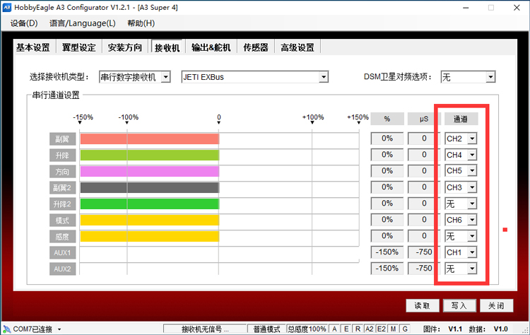 通过调参软件或设置卡,将陀螺仪的接收机类型设定更改为“串行数字接收机->JETI EXBus”模式,并对通道定义表进行设置以符合发射机上的通道顺序,最后重启陀螺仪使新的设置生效。