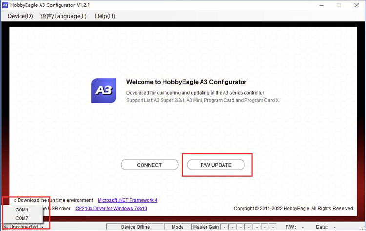 Run the A3 Configurator, choose the port number from the list on the bottom-left corner, then click F/W UPDATE button or choose Firmware Update from the Device menu.