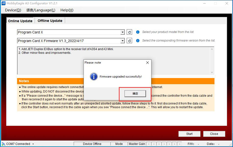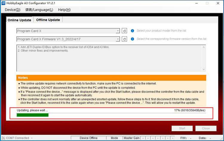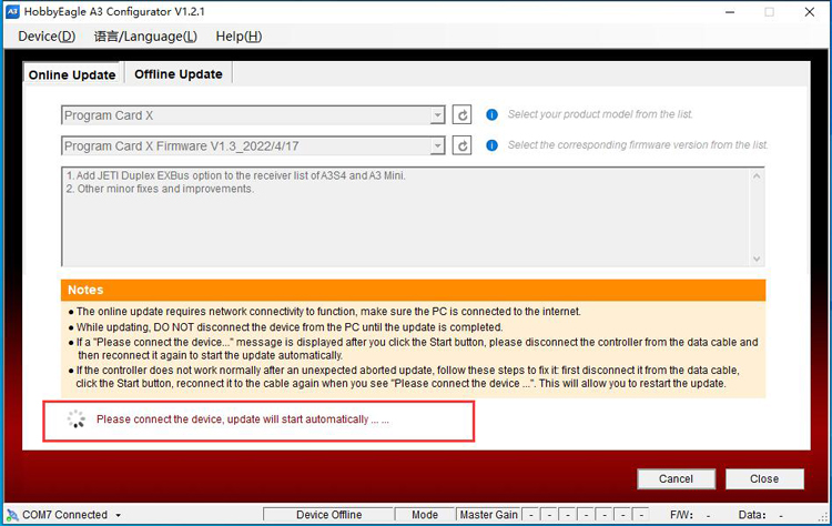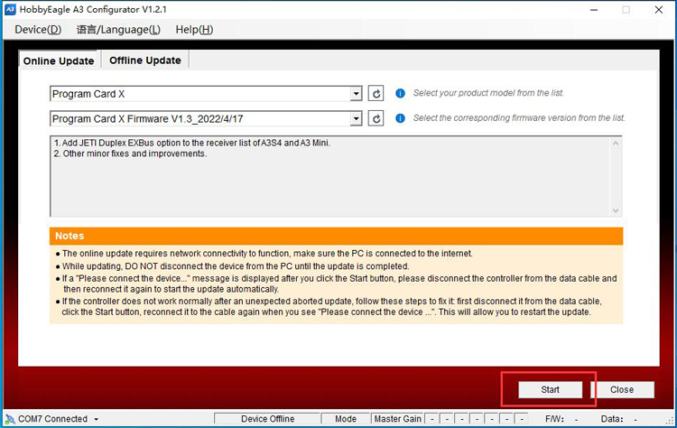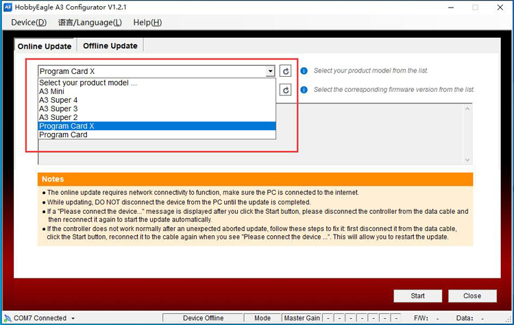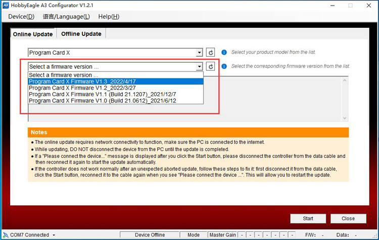 The online update requires network connectivity to function, the program will get the latest firmware list from the server. First choose Program Card X or Program Card from the list according to the version of yours, click
