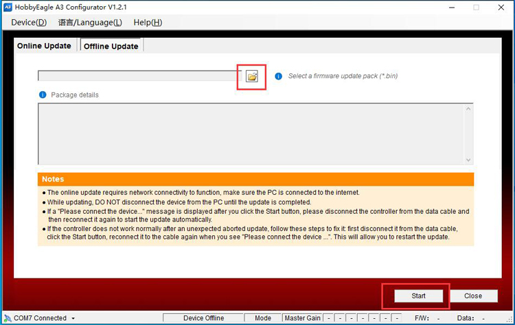 In the Offline Update tab, choose a local firmware file (*.bin) on the PC, then click Start button to start update. The following steps are the same as online update.