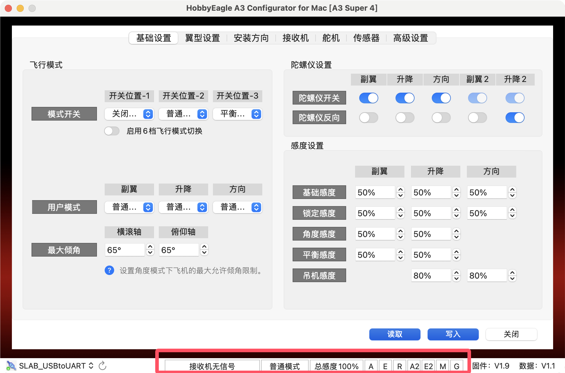 调参界面下方显示了陀螺仪当前的状态信息,包含陀螺仪状态、飞行模式、总感度大小、各输入通道的连接状态等: