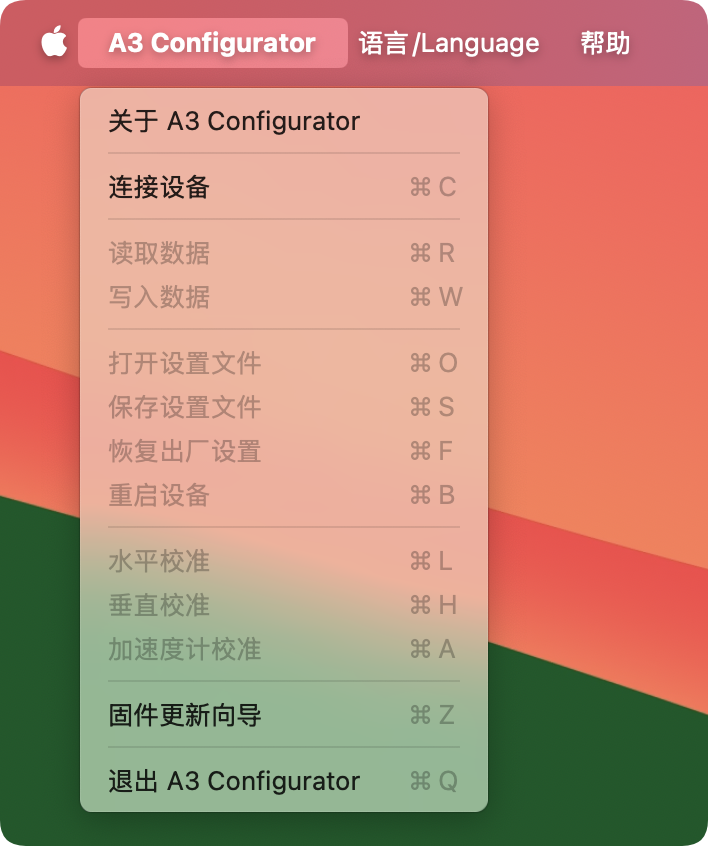 A3 Configurator支持简体中文、繁体中文和英文界面,点击菜单项“语言/Language”,选择相应的语言,重启软件即可生效:
