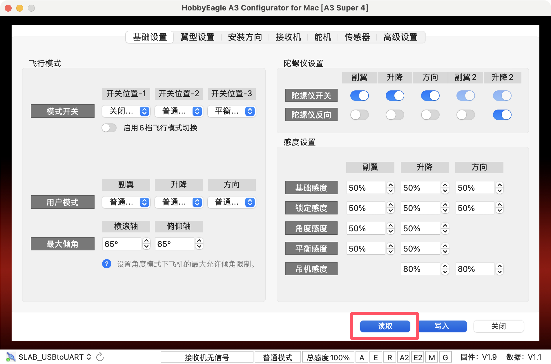 点击“读取”按钮可以重新读取陀螺仪中的设置数据,重新读取将覆盖调参界面中未保存的数据: