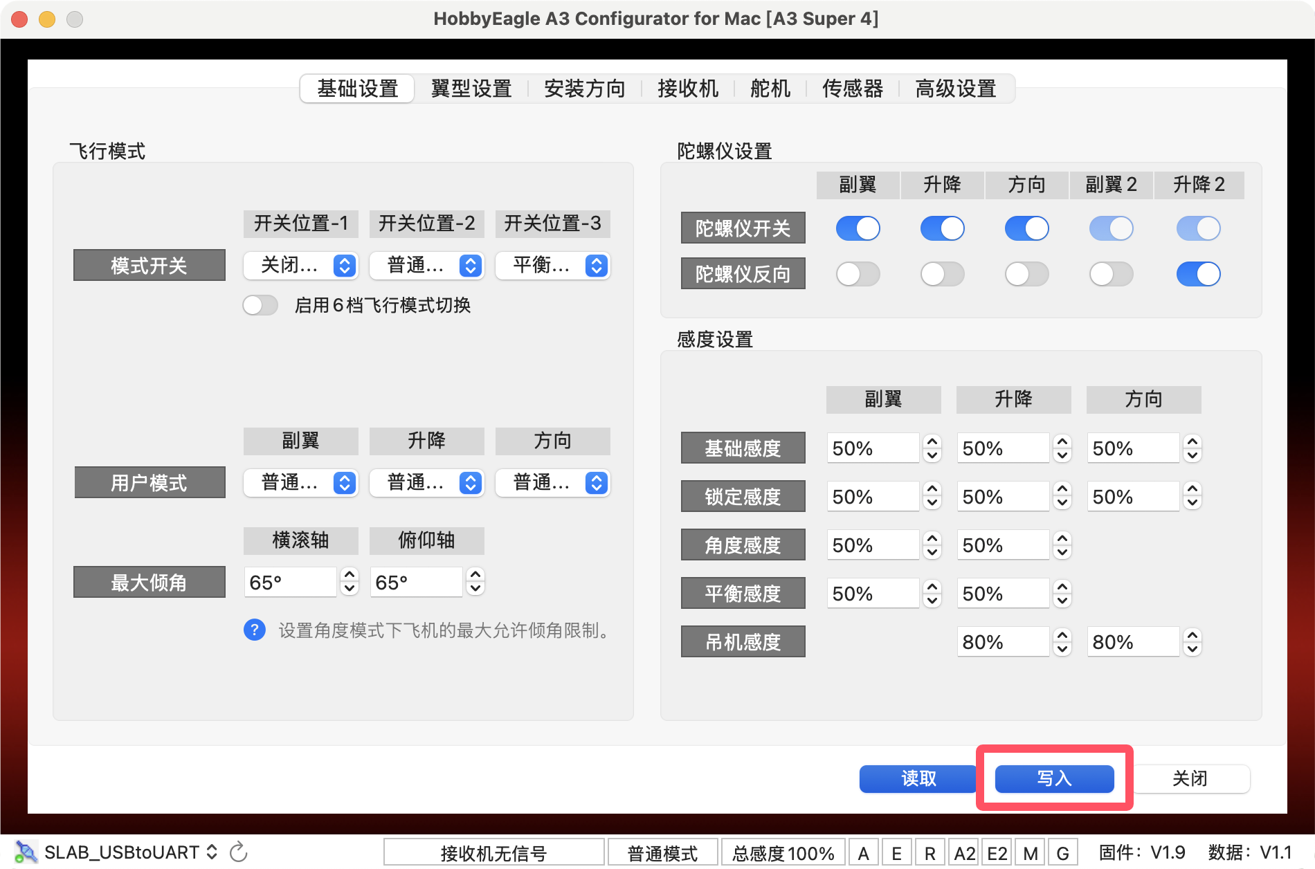 修改完设置后,点击“写入”按钮,将更改保存到陀螺仪中: