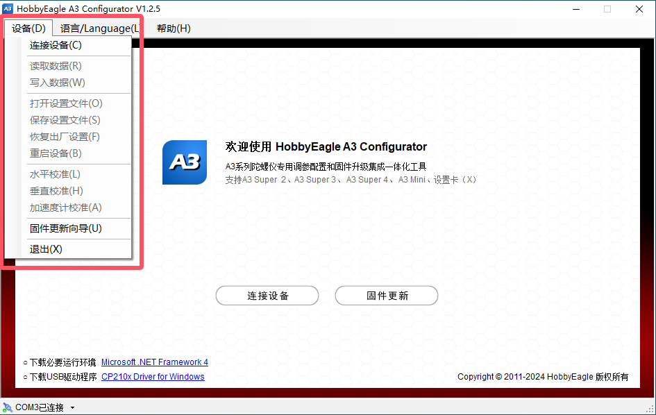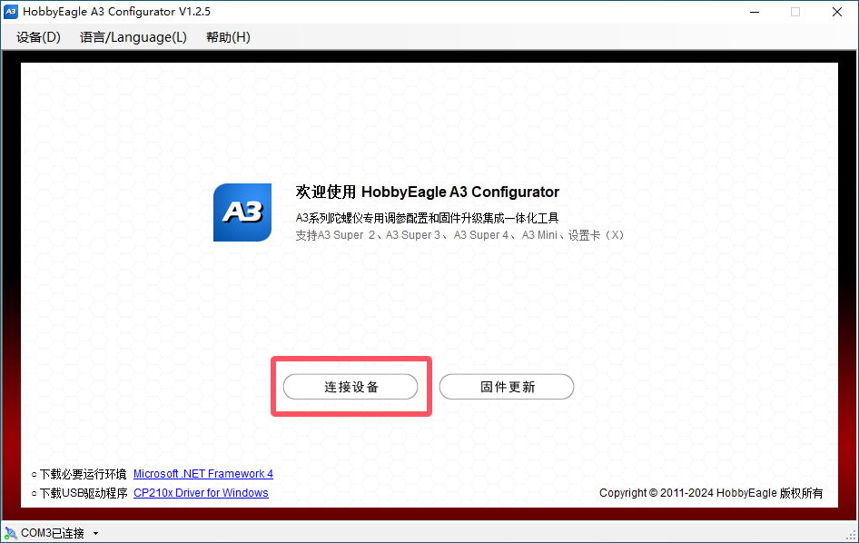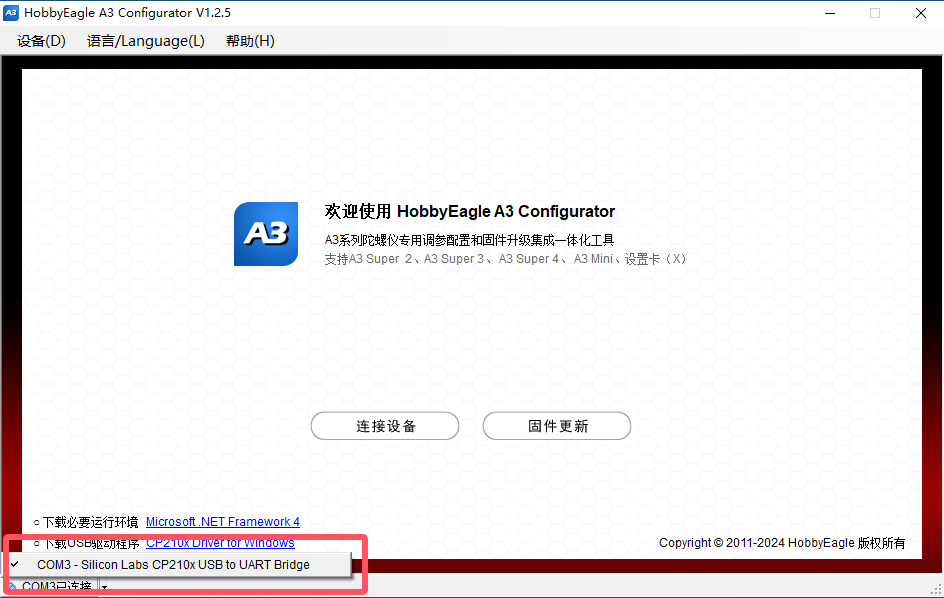 将USB适配器插入电脑的USB端口,运行 A3 Configurator,打开主界面,在左下角选择 COMx - Silicon Labs CP210x USB to UART Bridge 端口,如果您正确安装了USB驱动程序,软件一般情况下会自动选中该端口,如果端口列表中没有这个端口,请重新安装驱动程序。