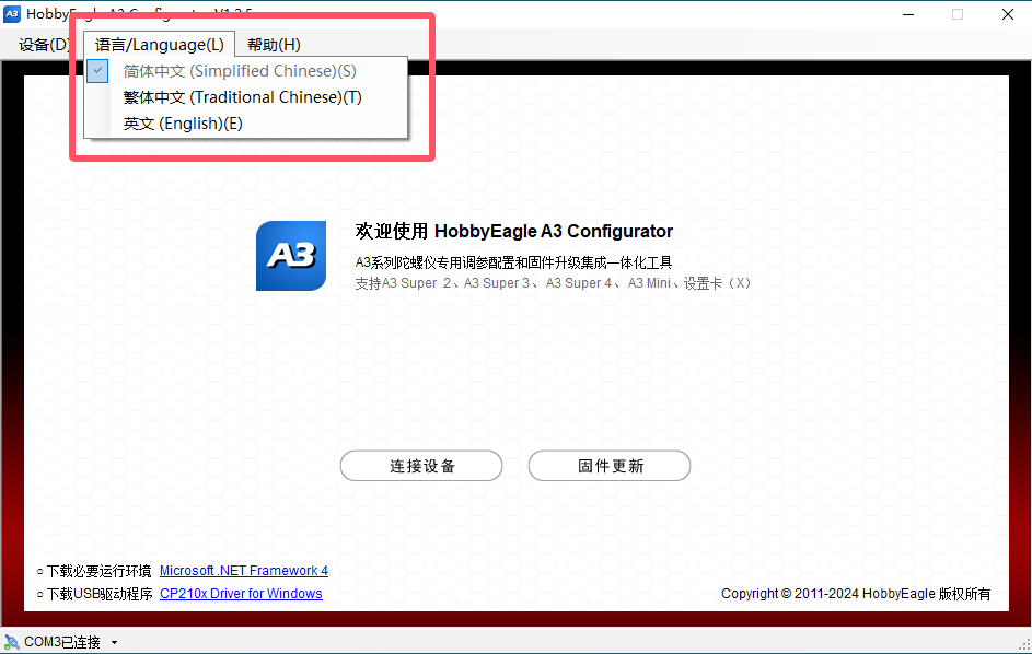 A3 Configurator支持简体中文、繁体中文和英文界面,点击菜单项“语言/Language”,选择相应的语言,重启软件即可生效: