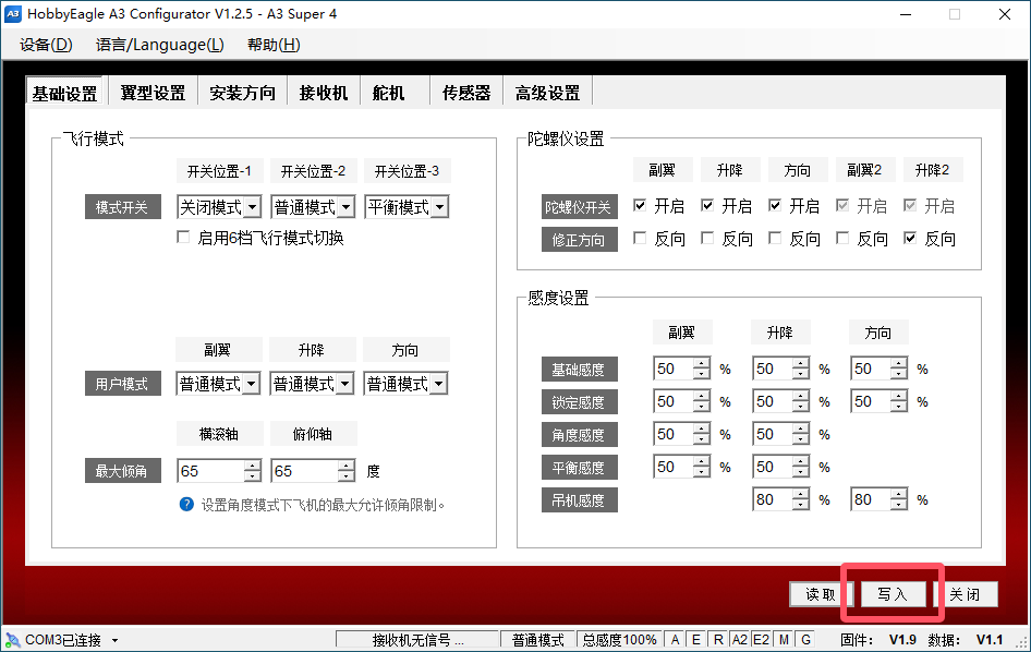 修改完设置后,点击“写入”按钮,将更改保存到陀螺仪中: