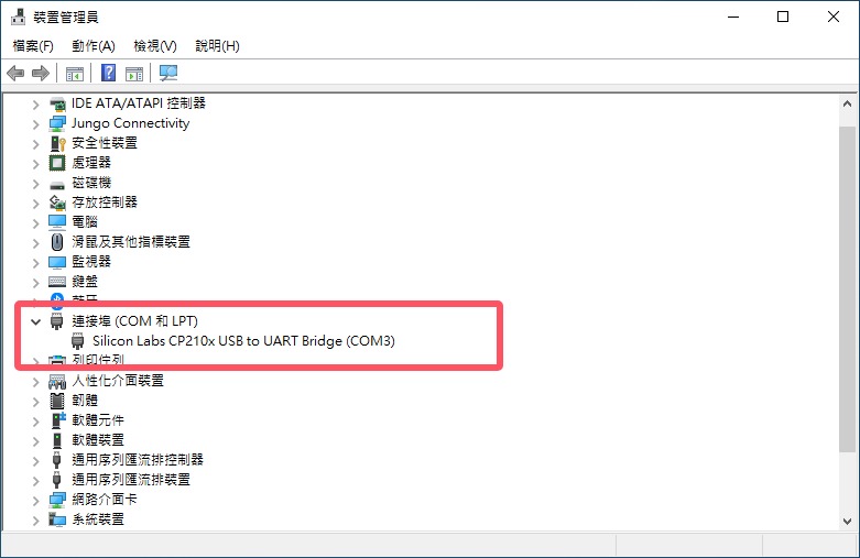為了驗證驅動程式是否安裝成功,將USB適配器插入電腦的USB端口,Windows 10 進入"設定 > 系統 > 關於 > 相關設定",Windows 11 进入"設定 > 系統 > 系統資訊 > 相關",找到並打開 "裝置管理員",在 "連接埠(COM和LPT)" 列表中如果出現"Silicon Labs CP210x USB to UART Bridge (COMx)"表示驅動程式安裝成功,記住端口號"COMx",之後會用到: